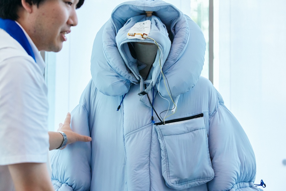 こちらは最適な睡眠環境を提供するアパレルシステム。眠りたい時にすぐに眠れる、ウェアラブルな布団のようなもの。心拍数やストレス値などの生体データをモニタリング・記録し、それに基づいて照明や音響を調整することで、最適な睡眠環境を提供します。