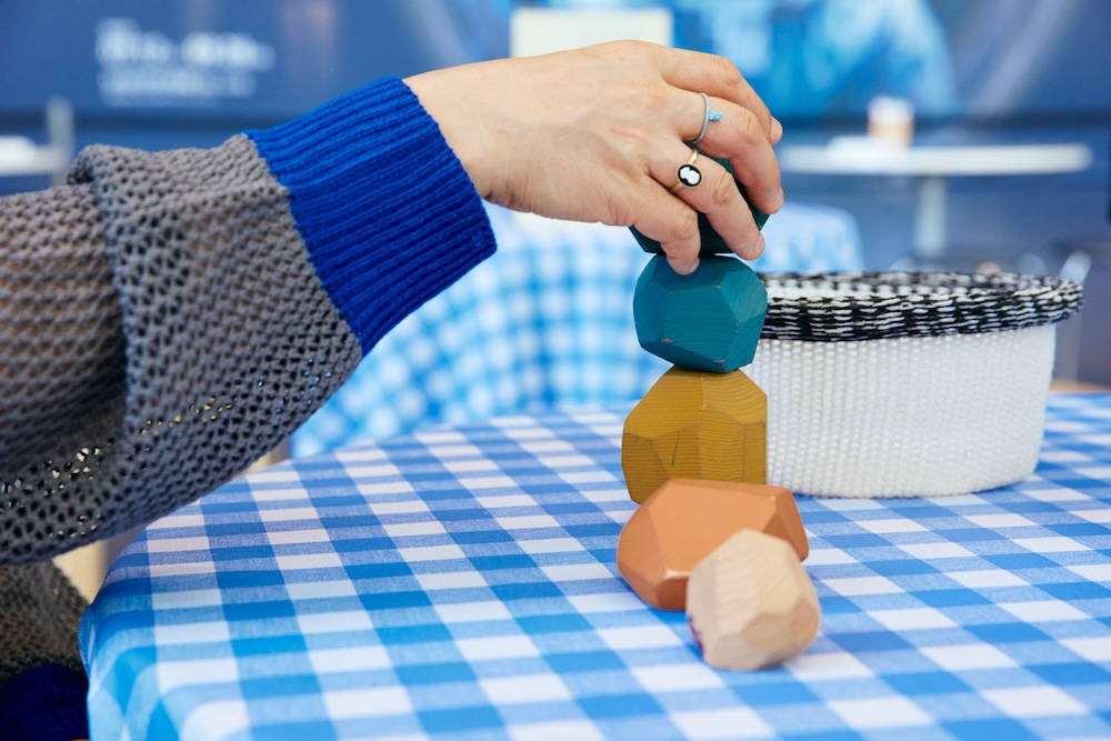 「何かに集中することで、無になった経験はありませんか?」と渡邉さん。こちらは、積み石を木のブロックで再現した積み木。1つ1つ職人の手作りで、それぞれ微妙に形が違うのだとか。子供から大人まで人気の玩具です。