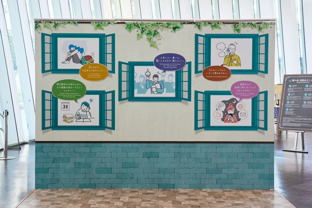 さて、まずは「自分の疲れに気付く」ためのコーナーから観ていきます。大きなボードに日々を忙しく生きる現代人たちの心の声がフキダシになって描かれています。満員電車に乗った人が「人多いよー。暑いし、眠いしもうやだ、帰りたい……」とつぶやくシーンが。「ご自身と重なる人はいませんか?」と渡邉さん。(確かに、こんなふうに感じたこと、あります!)このように、今まで「プチストレス」と思っていたことが、実は「疲れ」だったと気づけるような仕掛けになっています。