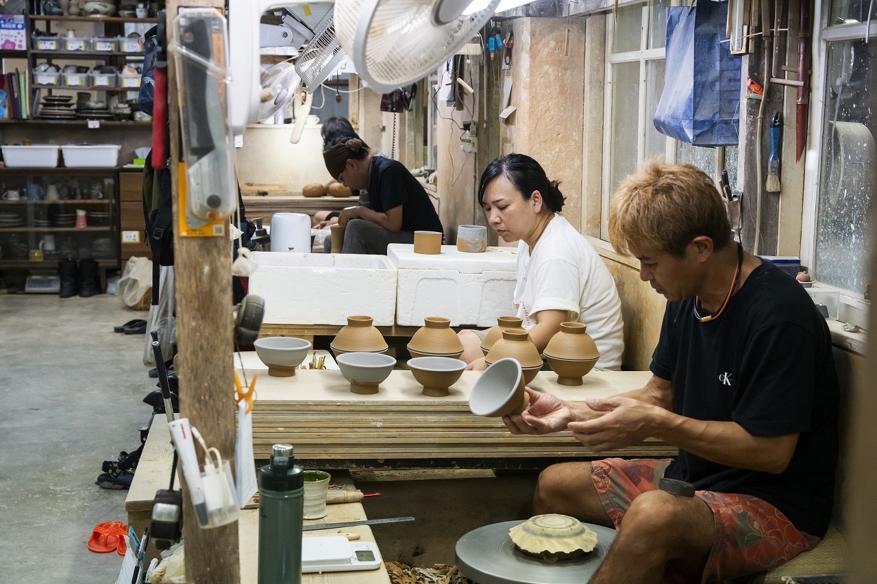 私は職人ではありませんが、父や弟をはじめ、多くの職人が日々ものづくりに取り組む姿を身近に見ています。そのなかで痛感するのは、人材の確保よりも技術そのものを継承する難しさ。特にろくろの技術は習得に最低3年を要し、その間は商品となる器はなかなか作れません。さらに習得後も長い修練が必要で、必ずしも理想的な形を作れるとは限らないんです。働き方改革によって、一昔前のように時間を惜しまず作業できる環境もなくなり、世代ごとに技術の差が広がっているのが現状です。