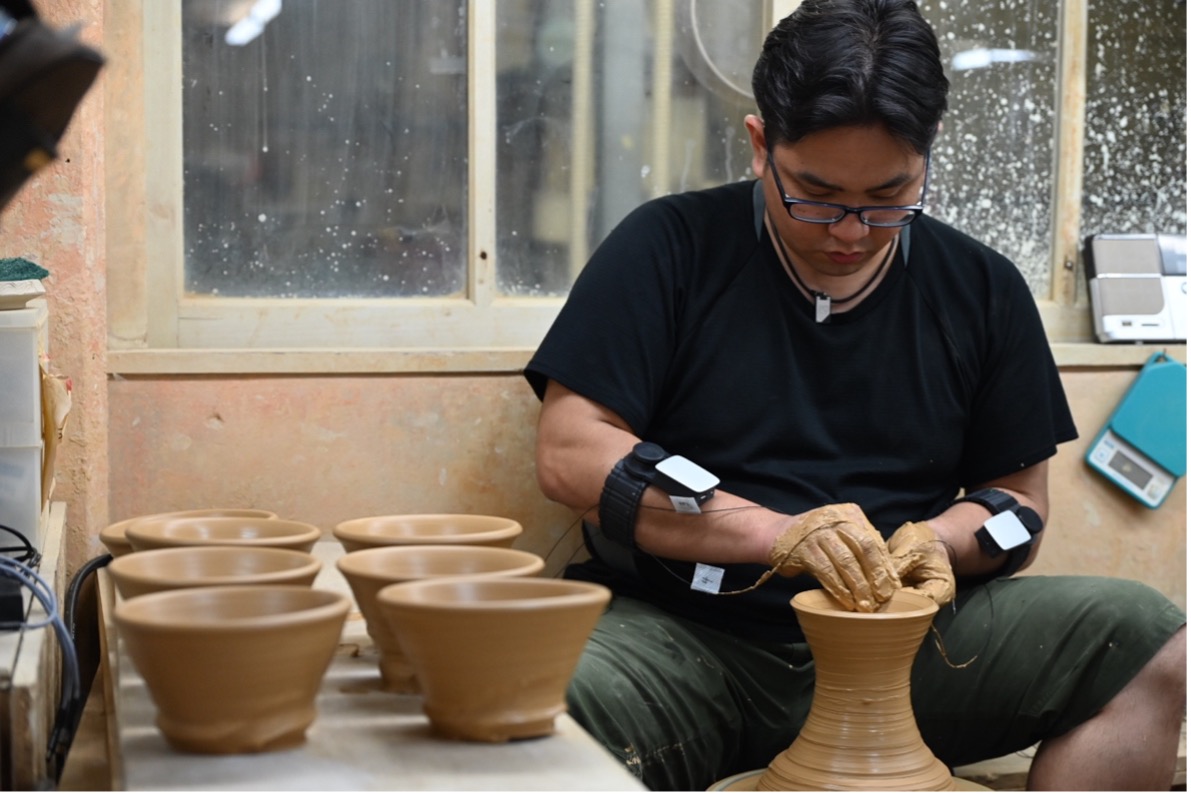 現在のハプティクス技術では、まだまだ指先や手のひらの複雑な使い方を完全に再現することは難しいんです。現状のセンサーで記録できるのは限られた点に過ぎず、まるでモザイク越しに見ているような不完全さが残ります。とはいえ、これまで研究室のなかで大がかりな装置が必要だった技術を工房の現場に持ち込み、実際に陶芸をしながら記録できるまでに進化したのは大きな前進です。