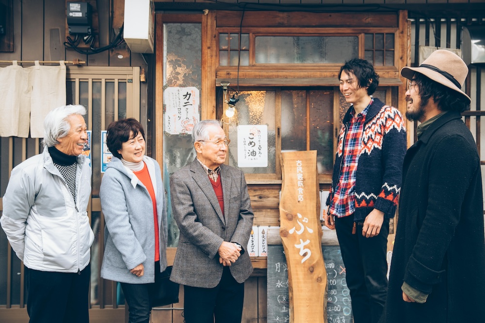 飲食店の大家さんと話す水谷さん(右)、共同代表の藤田恭兵さん(右から2人目)。