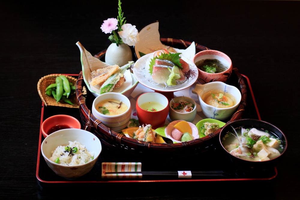 〈庄内ざっこ〉では、鶴岡市近郊で採れる魚や野菜などを使った郷土料理が味わえる。写真の「華籠御膳」はお店の人気メニューのひとつ。