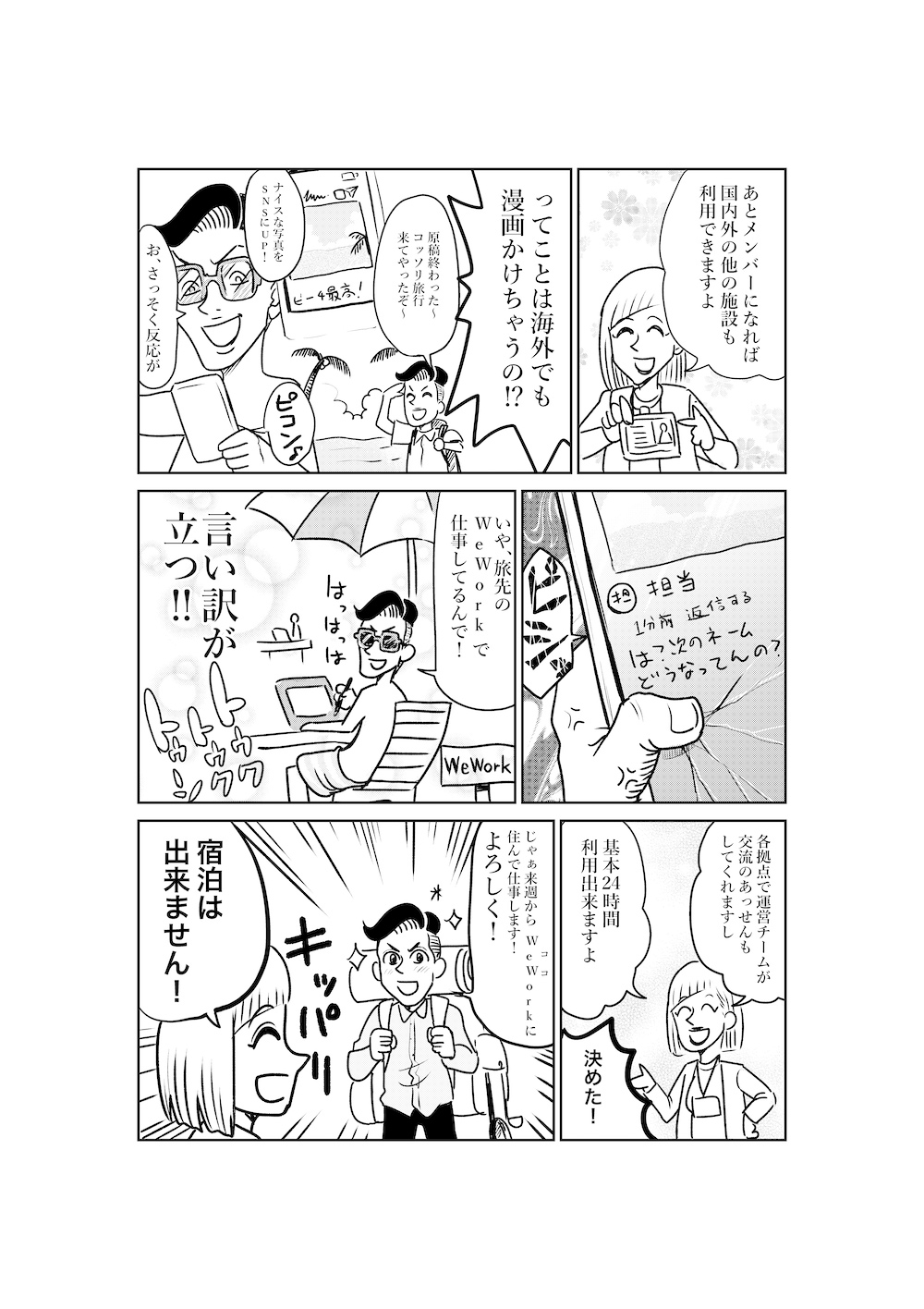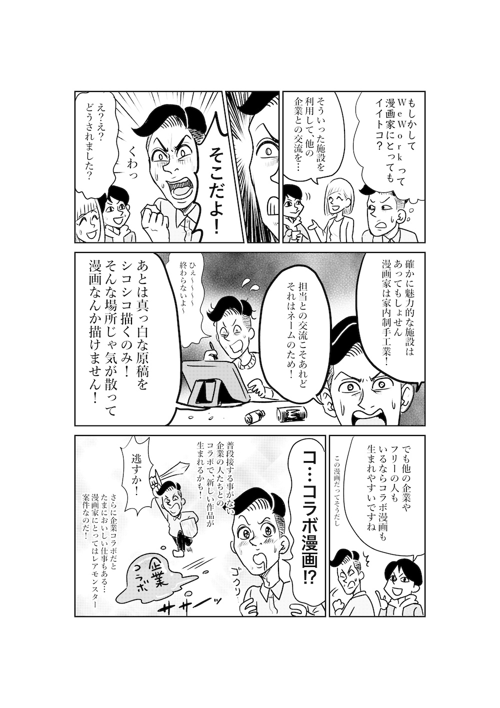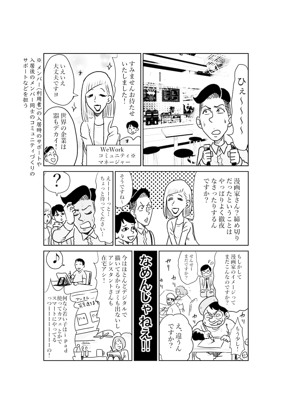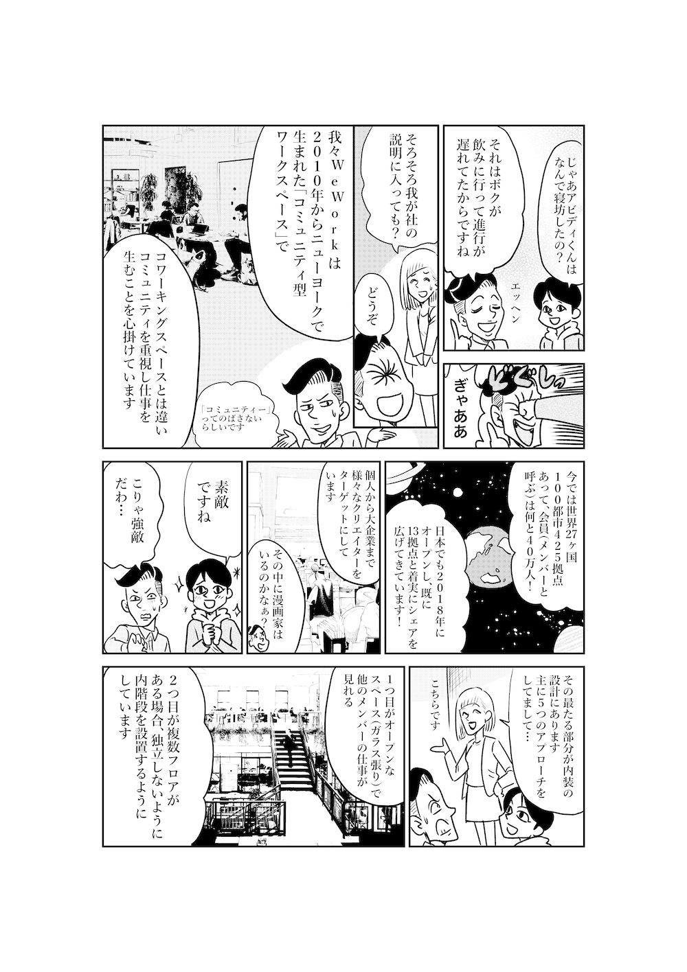 未来に向けて、新しい分野に挑戦する会社を見学するこの企画。今回の舞台はコミュニティ型ワークスペースを提供するWeWorkです。定時に会社に行き週5日働くという従来の常識がだんだん変わってきている現代。リモートワークやシェアオフィスなどで働く人も増え、働き方も多様化しています。働くすべての人を応援するWeWorkを漫画家のアビディ井上さんと一緒に見学してきました。漫画家の働き方も変化しているようです。(漫画:アビディ井上さん)