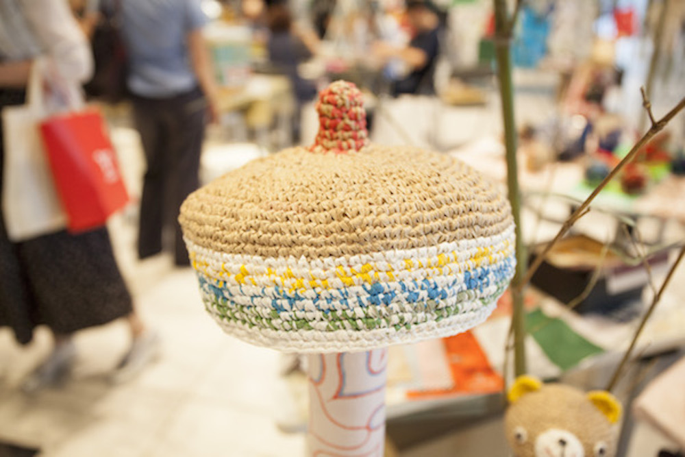 こちらは佐藤ちかさんの作品です。普段お店でもらうような紙袋の取っ手部分をカットし、それをほぐして裂き、つなぎ合わせ、紙の糸玉を作ります。それらを素材に、植物や動物をモチーフにかぎ針で編み上げる方法で作品を制作しています。