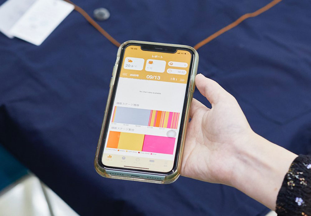 そうですね、Xenomaでの名称は「e-skin Sleep & Lounge」です。そして、今年6月にファッションブランド「アーバンリサーチ」から「デジタルヘルスケアパジャマ」という名前で販売されています。これまでのぴったりとしたスーツではなく、ゆったりとした洋服を着て睡眠を解析してもらうものです。ポケットにセンサーデバイスと服の中に温度センサーがあり、睡眠時間や布団の中の温度変化といった睡眠に関する情報がアプリで管理できます。ゆったりしたデザインだと、睡眠中に呼吸と心拍を測ることしかできないけれど、健常者はそれで十分だということで着心地や日常への取り入れやすさを重視しています。