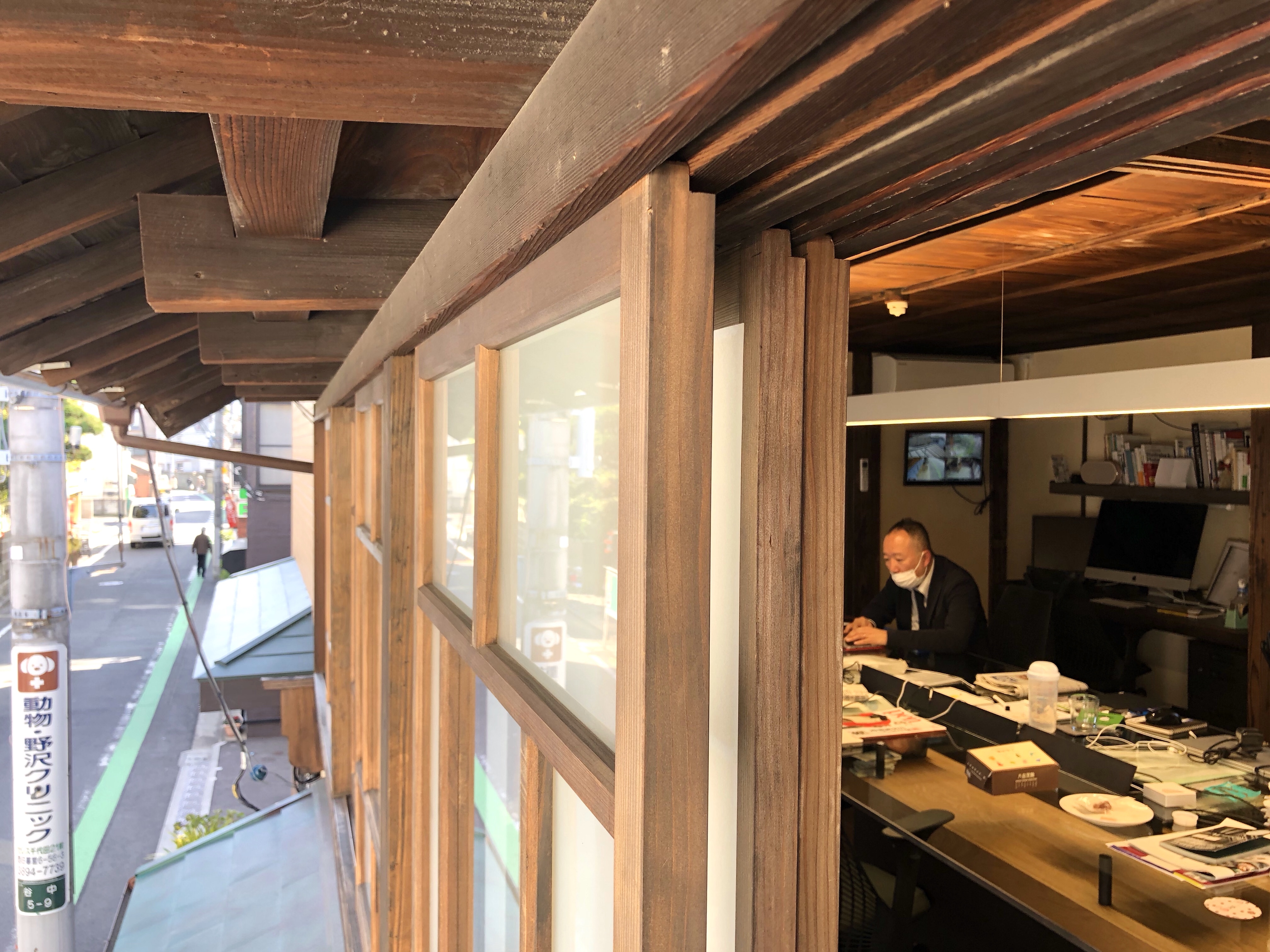 木造の窓や庇と、ガラスのテーブルやパソコンに、