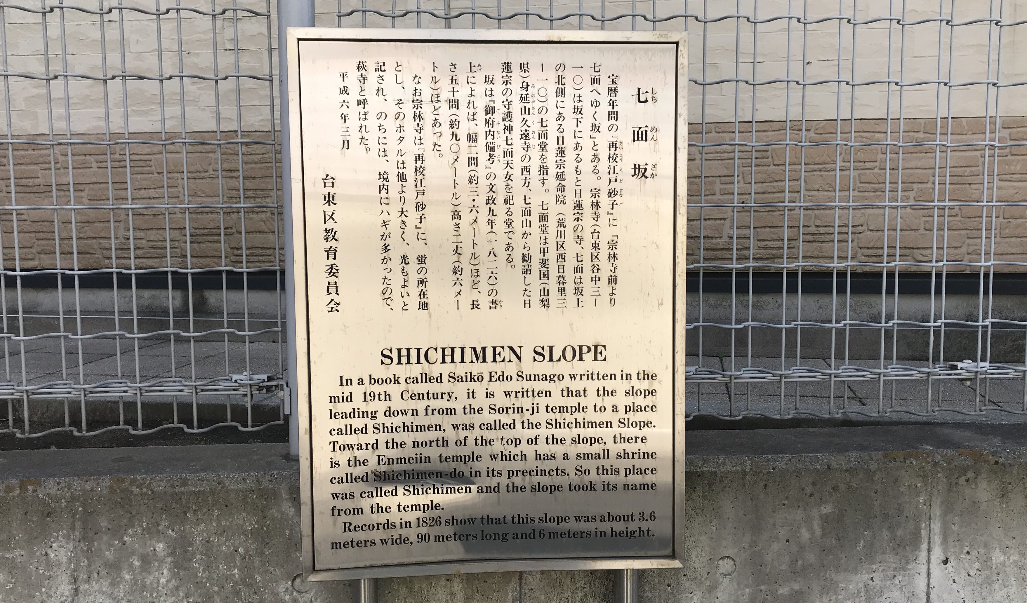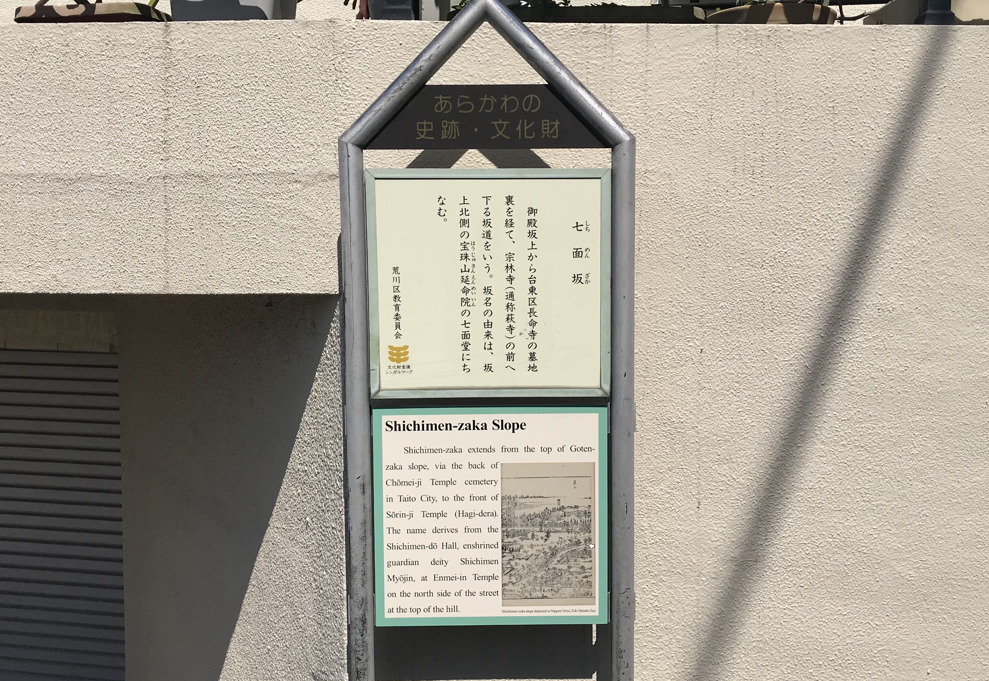 左手は台東区、右手は荒川区の両教育委員会が、同じ七面坂の説明をしています。