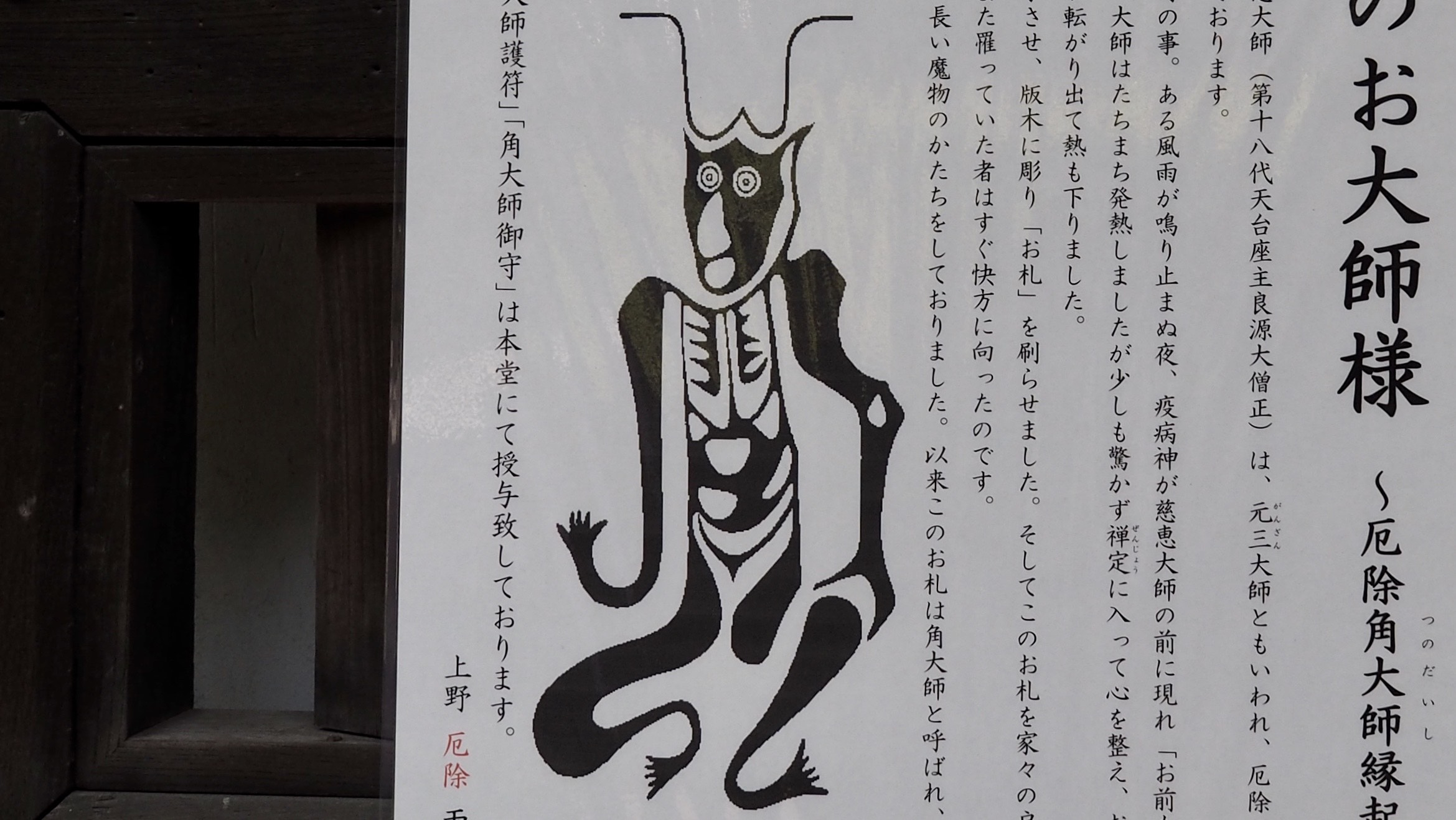 このお札の大師のお姿は、何と、角の長い魔物のかたちをしておりました。以来このお札は角大師と呼ばれ、厄除大師として広く信仰を集めています。』(上野 厄除 両大師堂)