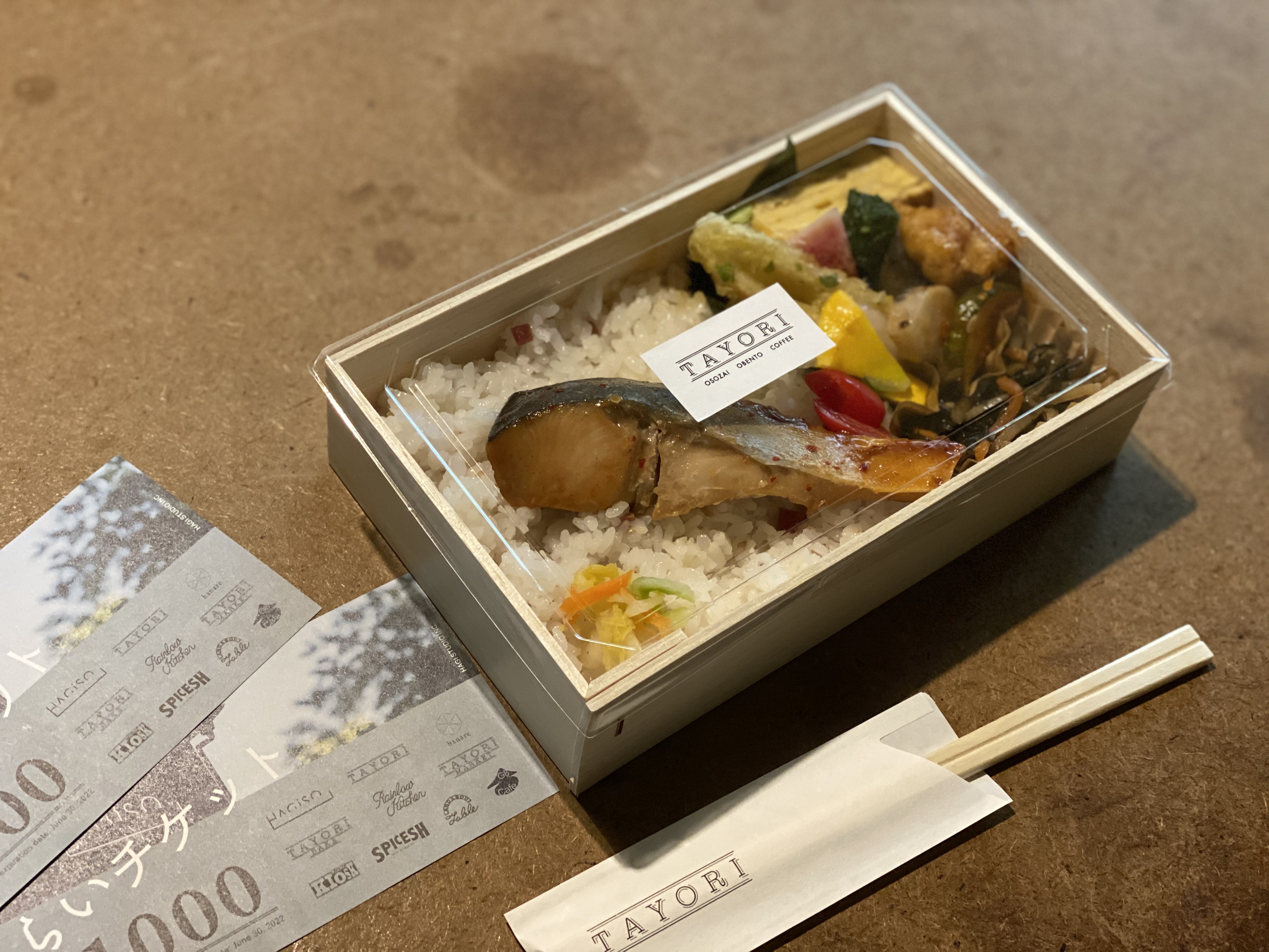 そうだ!自粛期間中に購入しておいたTAYORIさんの未来チケットがある。未来定番研究所とは深いお付き合いのあるTAYORIさんが、たまたま今日から通常営業に復帰、もうそれしかない!雨の谷中銀座を歩き、TAYORIの特別弁当をテイクアウト。どうやらTAYORIにとっても僕が一番乗りだったようだ。