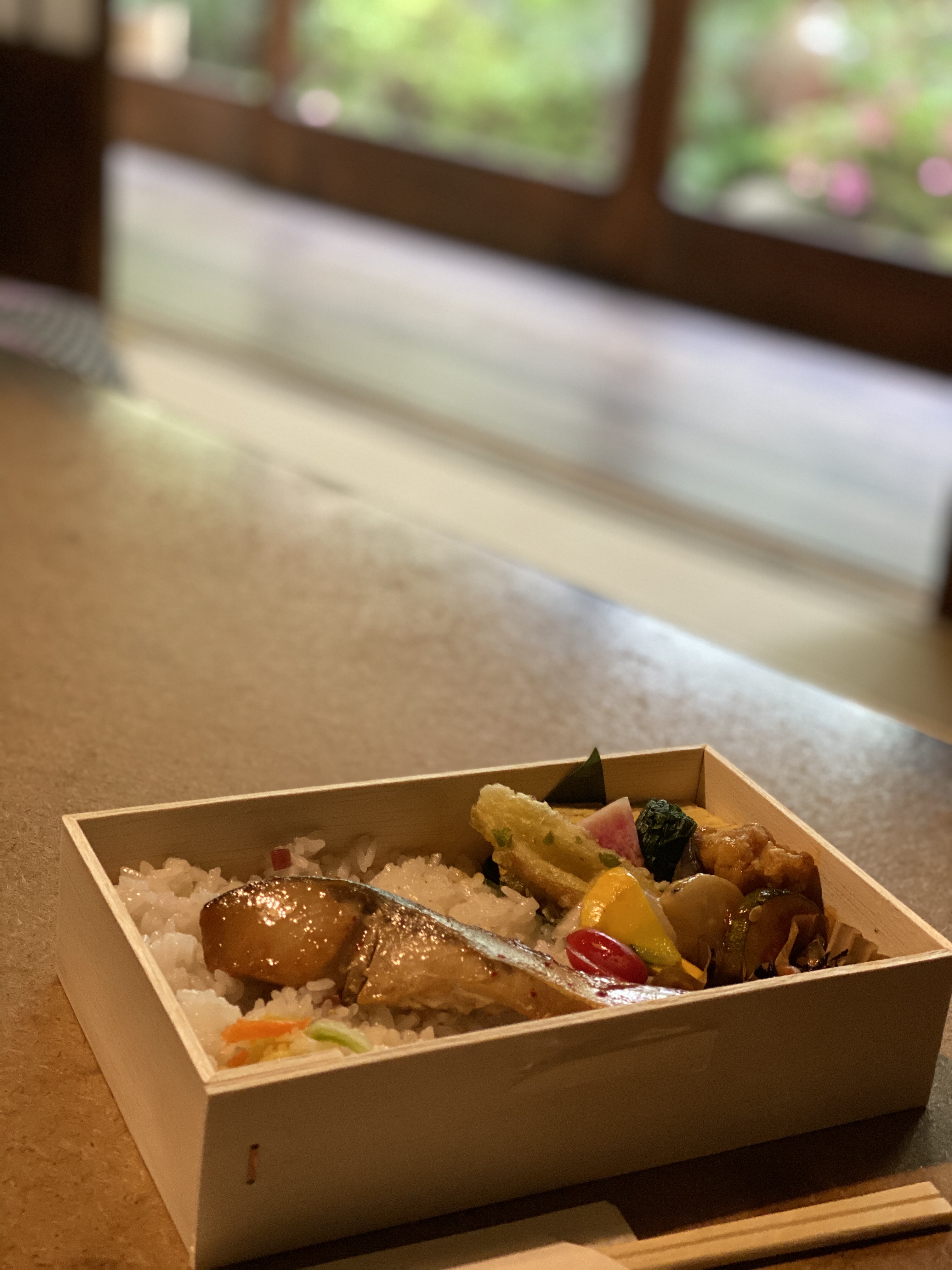 出勤したのは僕ひとり。和室で雨のお庭を見ながらのお弁当。なかなかいいではないか。コンパクトなお弁当だが、お惣菜が10種類近くも詰まってる。一つ一つ丁寧に作られた感じが伝わってくる。さすがである。