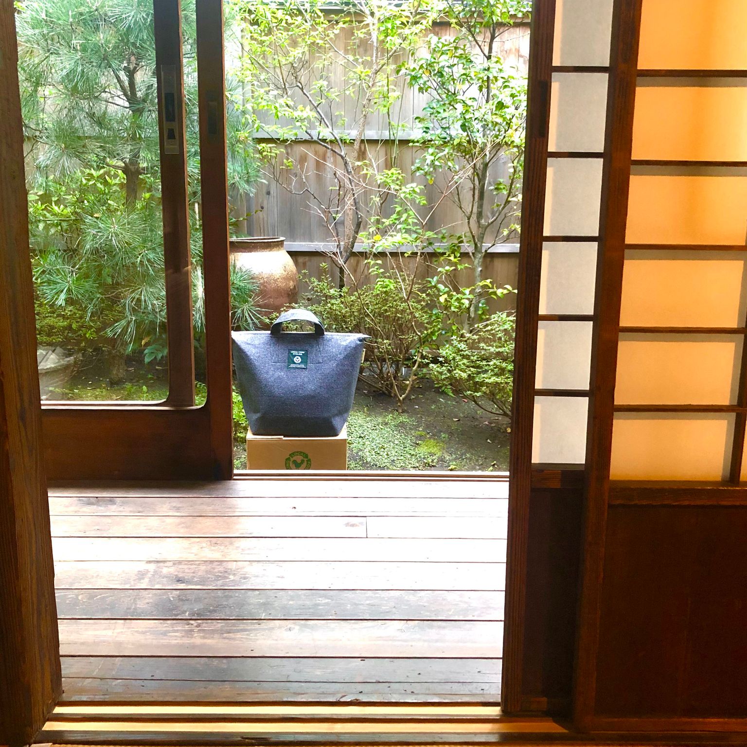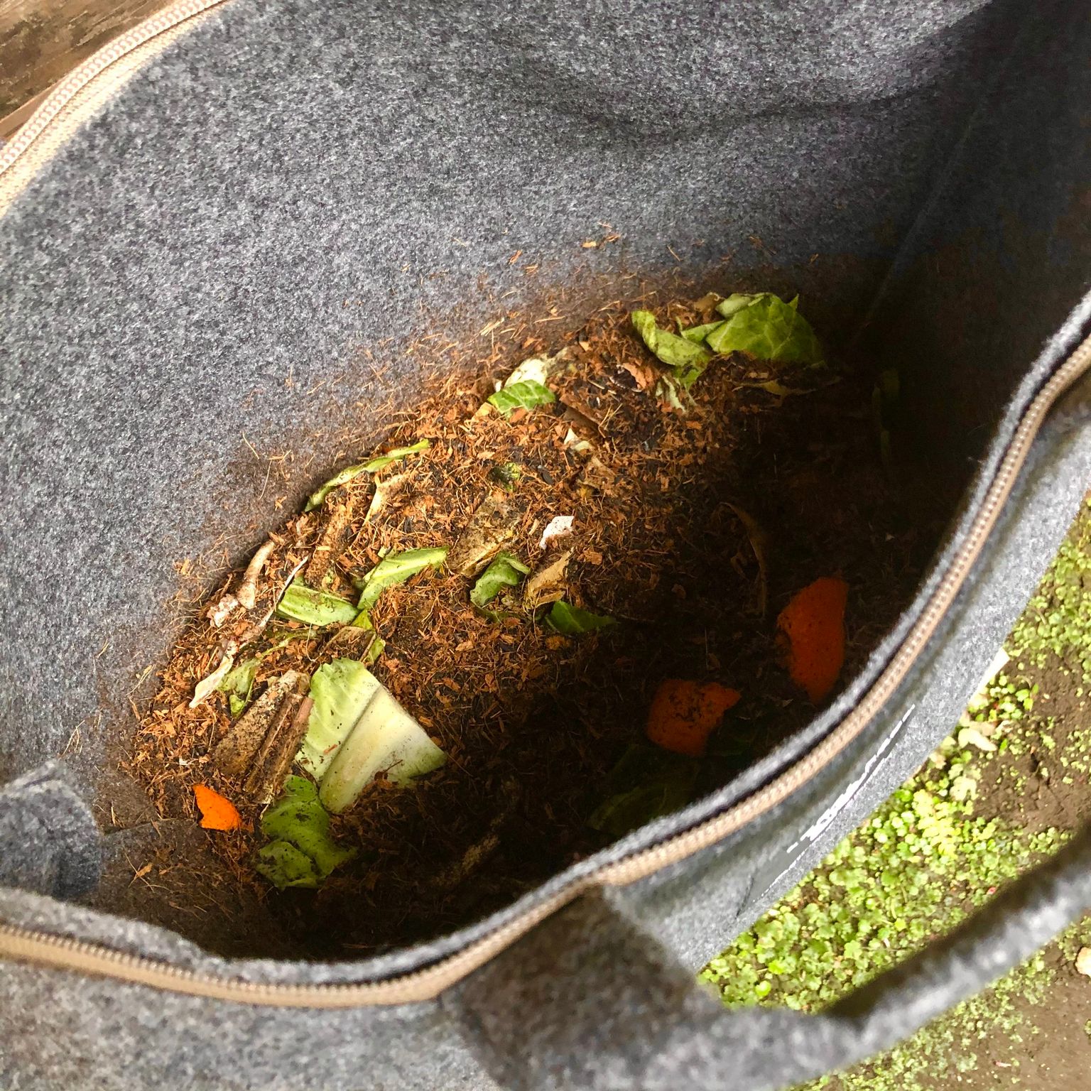 このおしゃれなバッグが、コンポストなんです(段ボールは設置台です)。