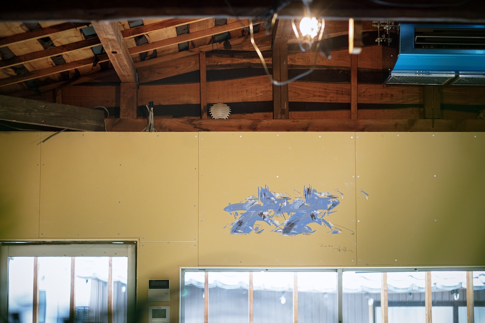 スタジオの壁に、アーティスト・小畑多丘さんのドローイングを発見。「本当はもっと小さく描いてもらうはずだったんですよ(笑)。真っ白な完成された壁ではないから、彼も自由に描けたのかもしれないですね」(関さん)