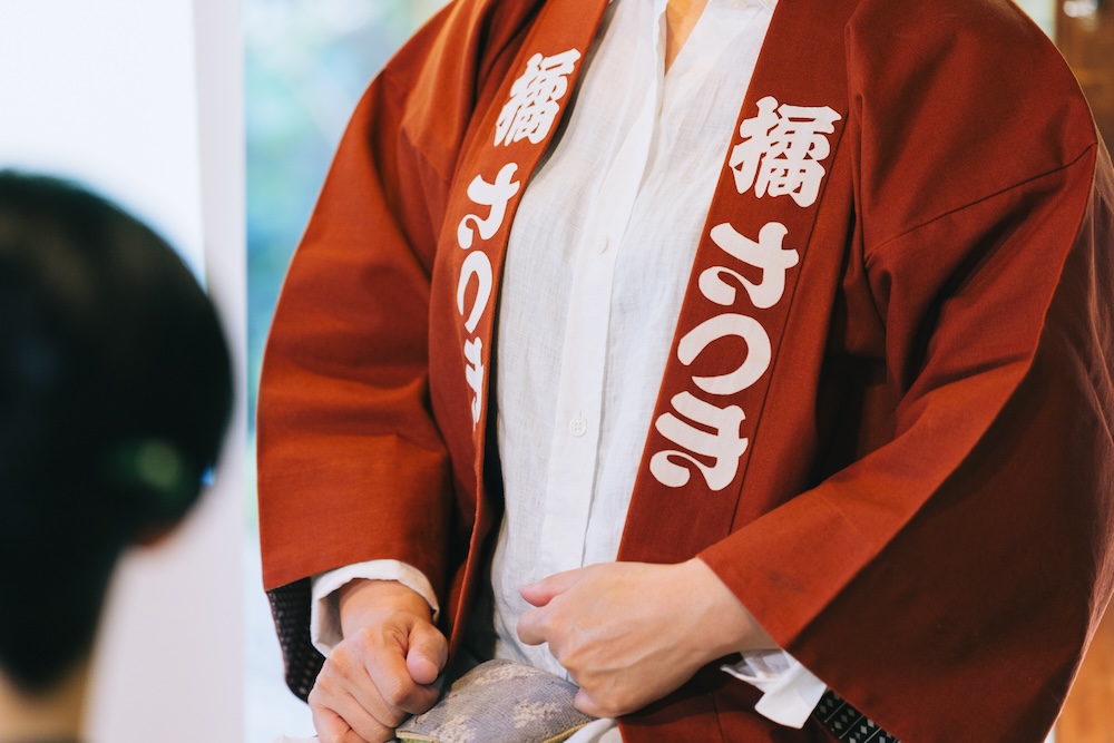 午後1時半、江戸文字で名前が書かれた半纏を着た橘さつきさんが登場。会場からは温かい拍手が起こりました。