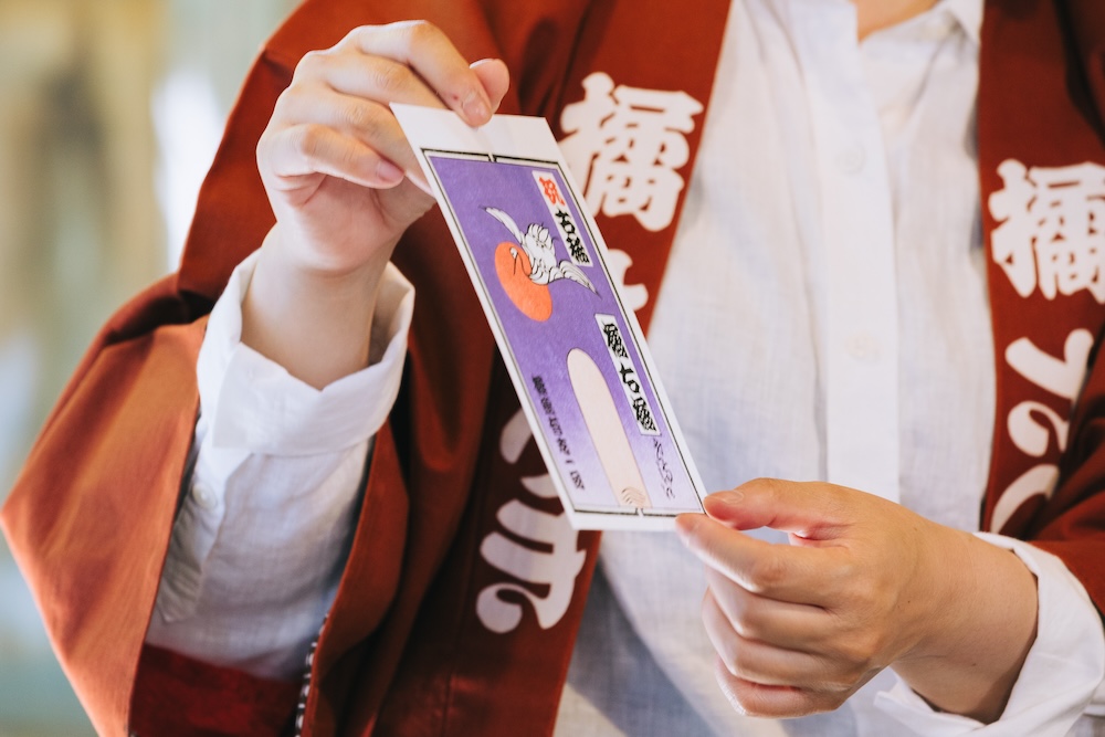 右橘師匠の古希のお祝いの札。福禄寿、鶴、日の丸の組み合わせのデザインはさつきさんがセレクト