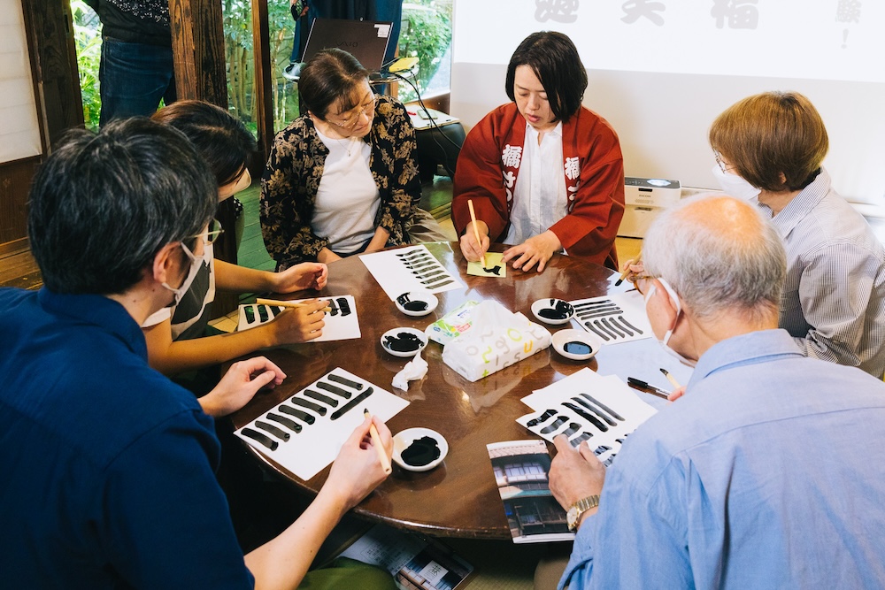 続いて、さつきさんが参加者に1枚ずつお手本を書いていきます。その間、参加者の皆さんは、練習用の紙に縦棒と横棒を書く練習。これが意外に難しい。さつきさん曰く、均一の太さになるよう腕を引きながら書き、余白も均等にすることがポイントだそう。