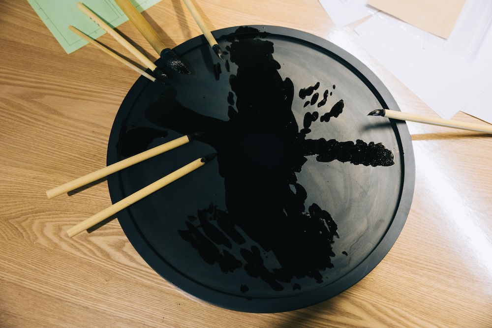 円卓の中央に置いて、鍋をつつくように、わきあいあいと書くことを楽しめたらいいね、というコンセプトのもと制作されました。墨汁を入れると中央に集まっていく仕組み。寄席文字を書く際は墨をすらずに墨汁を使うのも特徴です。さつきさんが墨汁を垂らすと、室内に墨のいい香りが広がります。