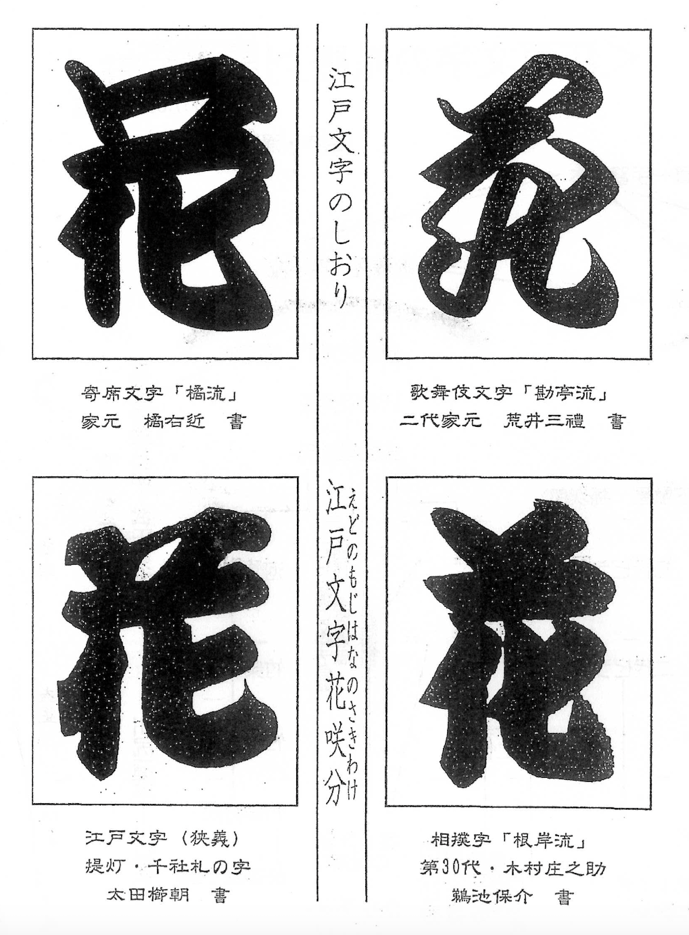寄席文字(左上)、勘亭流文字(右上)、江戸文字(左下)、相撲字(右下)。2007.02 橘右橘作成
