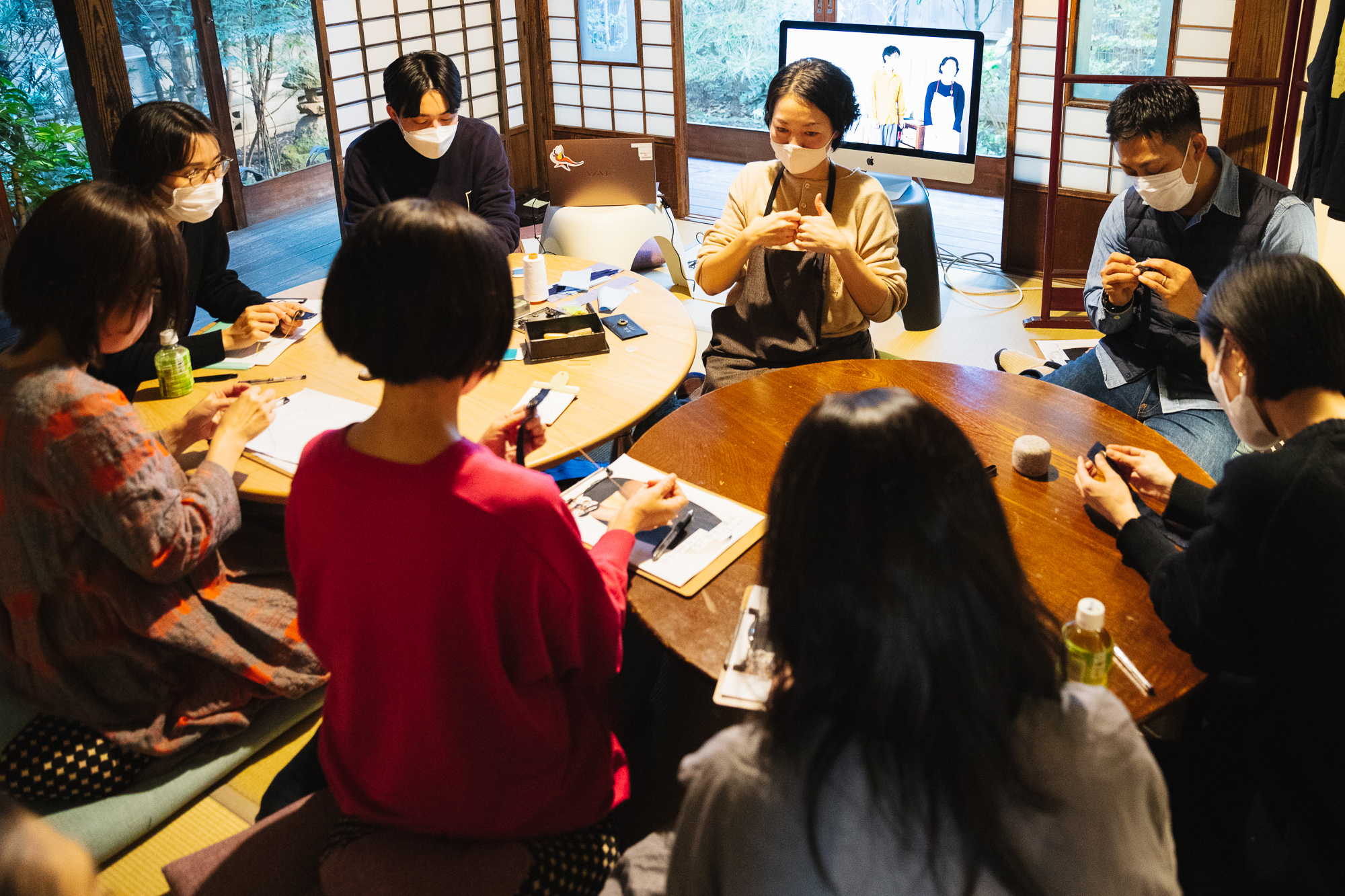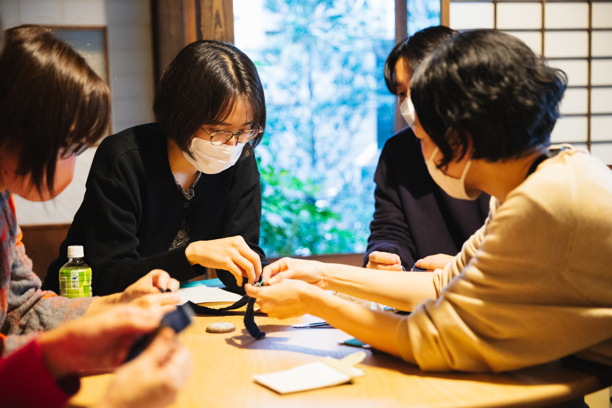 畳の上に置かれたちゃぶ台が2つ。その中央に早水さんが着席し、今回の参加者がぐるりと囲むように座ります。みなさんに参加理由を尋ねると、「おばあちゃんの裁縫道具を使いたくて」「昔習ったボタン付けをもう一度ちゃんと知りたい」などさまざま。そしてもちろん早水さんのお直しのファンという方もいらっしゃいました。