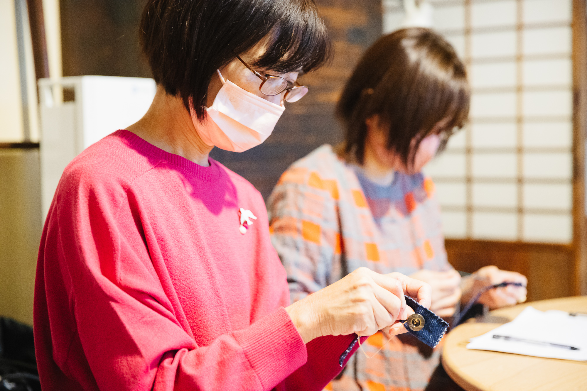 参加者のもとにはデニム生地とシャツ生地の2パターンが配られ、それぞれにボタン付けを施していきます。