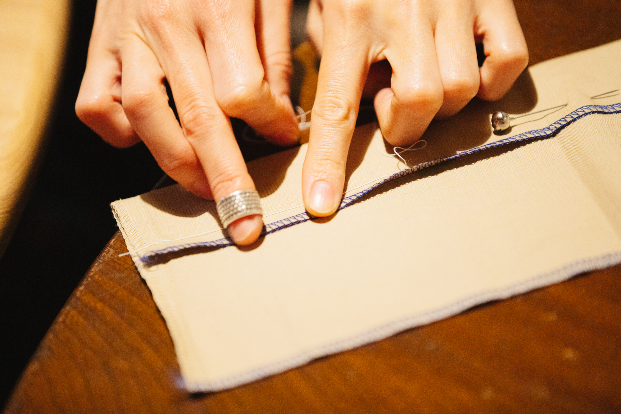 「あげたい丈の部分で固定するため、マチ針で止めていきます。より綺麗に仕上げたい方は、躾(しつけ)糸をしましょう。布をテーブルに置いたまま、なみ縫いするとよくできます。テーブルを傷つけないよう、下敷きを敷いてくださいね」