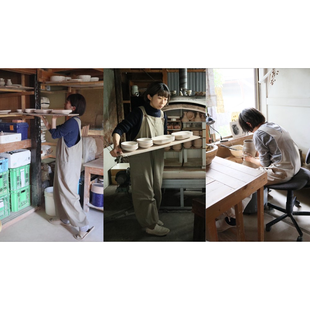 ろくろを挽く時、足を開いて座るのでパンツスタイルが基本です。足元にも粘土が飛ぶのでしっかり足首まで覆えるパンツをずっと探していました。また、作業では肩や腕をよく使って肩が凝りやすいので、いろいろと試した結果、長袖のつなぎではなく、肩まわりが軽やかに動かせるサロペットに辿り着きました。アジア雑貨のお店でみつけた理想的なサロペットを色違いで買って、毎日着まわしています。それと、私にとってサイズ感も重要。1年中、普段着の上に重ねて着ているのですが、厚手のニットからTシャツまで気候によって変わる服のどれにも重ねられるゆったりサイズなのがポイントです。リビングの隣に作業場があり、作業をしたり、リビングでお昼やお茶をいただいたりと、行ったり来たりするたびにサロペットを脱いだり着たりするので、脱ぎ着のしやすさも大事。これを着ると仕事モードに、脱いだらくつろぎモードにと、自分のON・OFFのスイッチにもなっています。近所へ買い出しに出る時、そのまま出かけてもOKなデザインも気に入っています。
