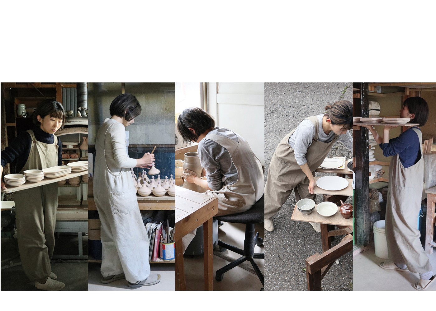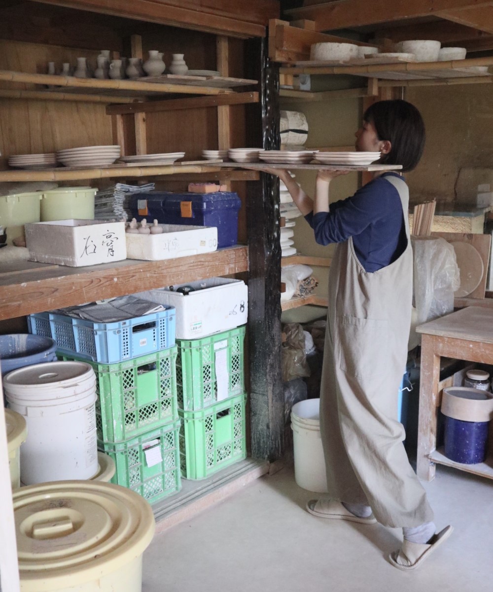 釉薬をかける前のものや乾燥させるものなど、作業場の棚で一時的に保管しています。重いものを高く持ち上げたり運んだりと、腕を上げ下げする作業も多いので、サロペットなら肩まわりの動きが制限されず、軽やかに動かせます。肩が凝りやすいので、腕の動かしやすさを重視しています。足元は、隣にあるリビングに楽に行けるよう脱ぎ履きしやすいようスリッパを履いています。