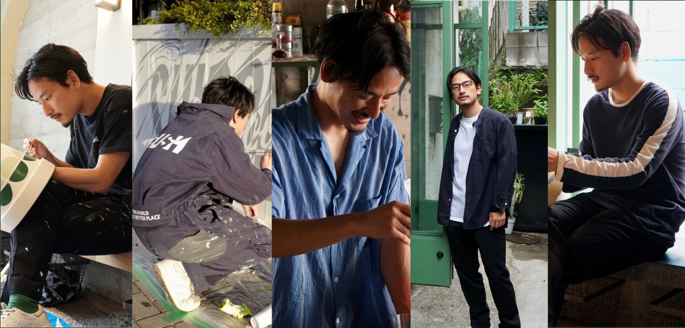 ペインティングなど体を動かす仕事も多いので、全体的に動きやすさを重要視しています。ボトムスは、黒、紺、グレーのスラックスが定番。それに、フードなどがついていないシンプルなデザインのトップスと、足元は白いスニーカーを合わせます。広告やコンサル業もやっているので、企業へ出向くことも。そんな時でもスラックスに白いスニーカーなら、程よくきちんと感が出るかなと。最近ではお店をまわって買い物をするというよりは、お店のお客さんや友人がやっているブランドのものを購入することが多く、それらがワードロープのベースになっています。海外にもよく行きますが、オーストラリアのメルボルン、NYのブルックリンといったような、カジュアルで無理をしていないリラックス感のある雰囲気の街が好きです。現地で出会うアートやインテリア、ファッションにインスピレーションを受けています。