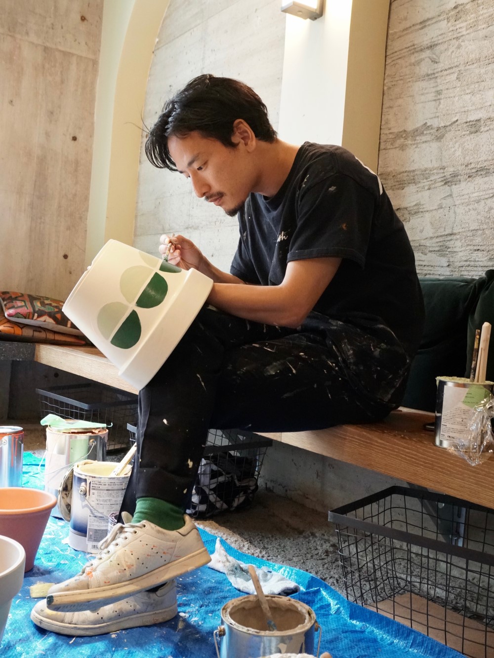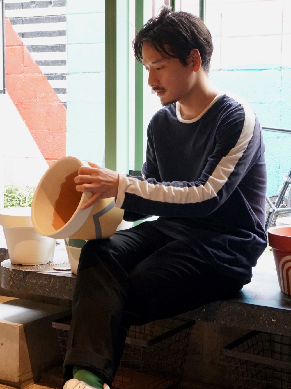 お店で作業をする日。オンラインで販売を始めたペインティングをしたポットは、1つひとつ手作業で描いています。汚れてしまったスニーカーやTシャツなどは、作業用に。服がシンプルでベーシックな色味が多いので、靴下の色で遊ぶようにしています。これはお店のオリジナルソックス。