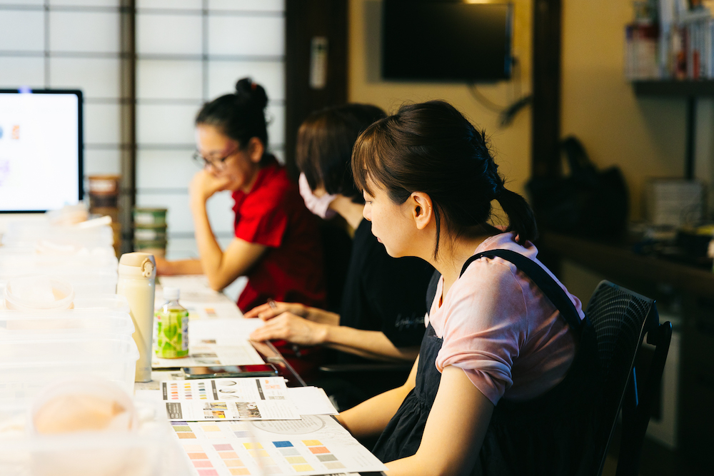 今回、新万葉染めをするのは綿のストール。2色を使いグラデーションに染めていきます。まずは参加者それぞれが色見本から染めたい色を決めます。