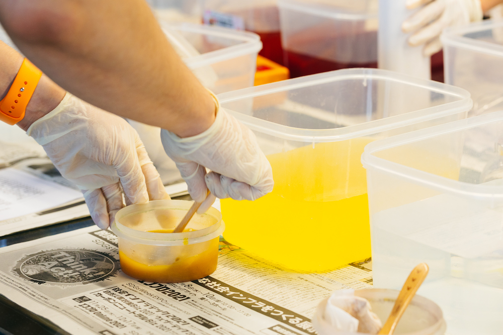 色を決めたら、川端さんが粉末状の染料を準備してくれます。染料はティーバッグのような紙の袋に入れられ、そこに各自少しずつお湯をかけながら色を出していきます。十分に色が出たところで、水の入った桶に流し入れます。2色分つくったところで染めの準備は完了です。
