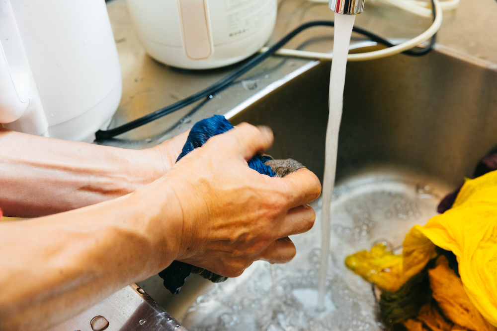 すべて染まったら、最後の仕上げにオリーブ石鹸でよく洗います。余分な染料を落とし、布に色を定着させていきます。この作業は川端さんが慣れた手つきでやってくださいました。