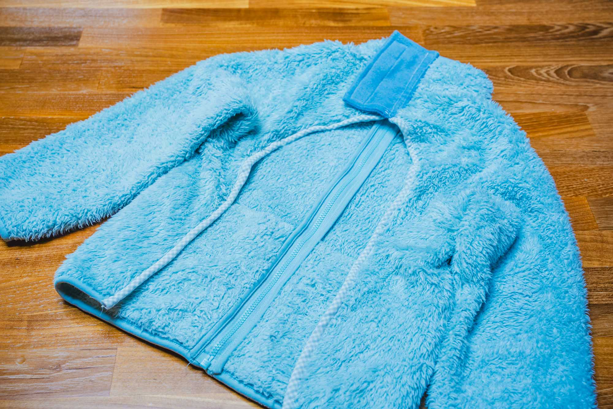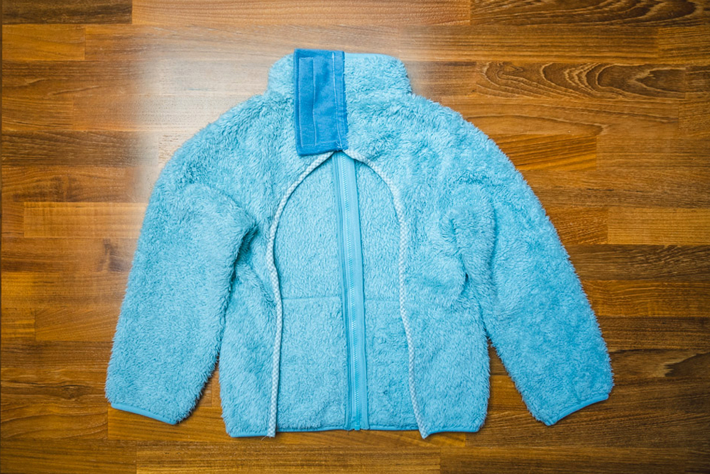 寝たきりの方でも着脱しやすいよう、背面に大きな切り込みを入れ、首の後ろ側にマジックテープを施したフリース
