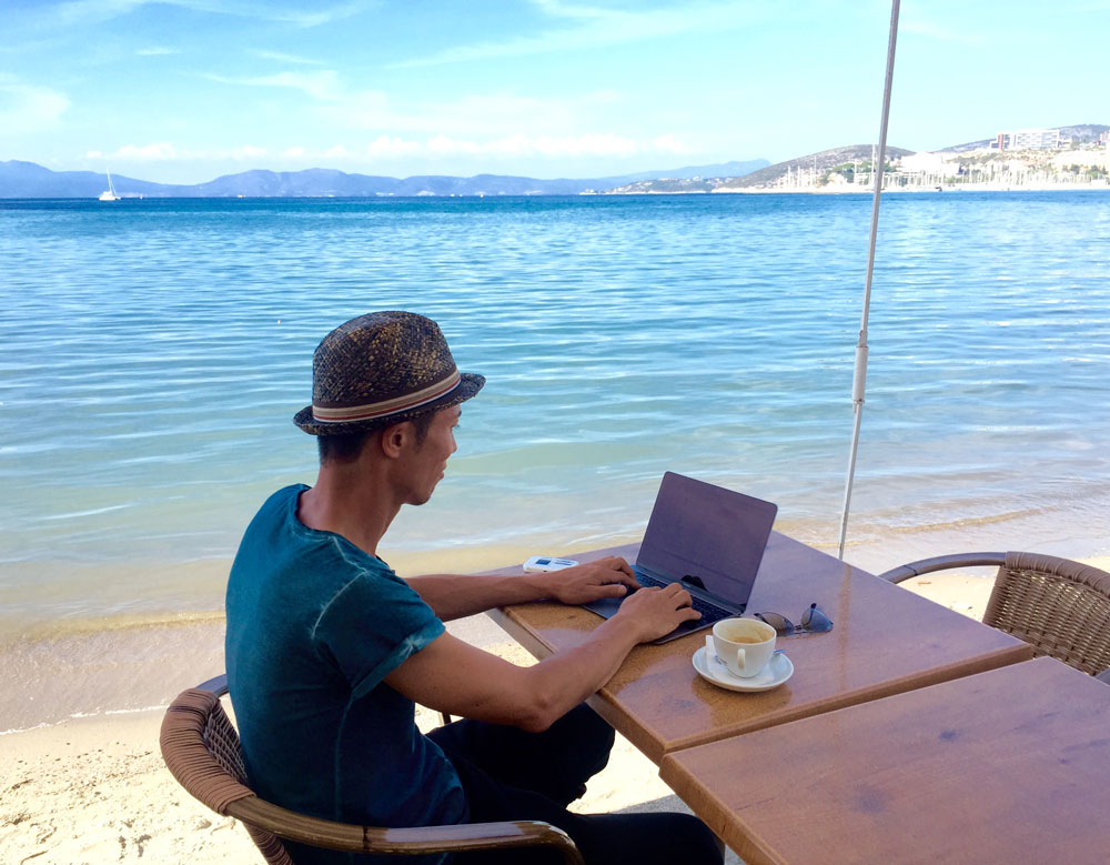 ギリシャの海辺のカフェで、仕事に励む四角さん。